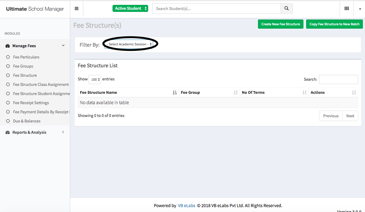 Step 3. Select the Academic Session for which you want to change the properties of a fee structure.