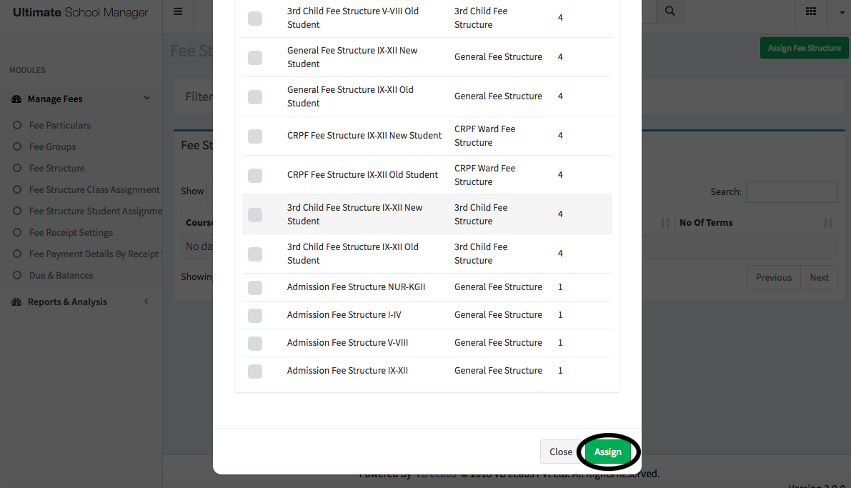 Step 5. After selecting the class, select all the fee structures you want to assign to the class and click on Assign option at the end of the dashboard.