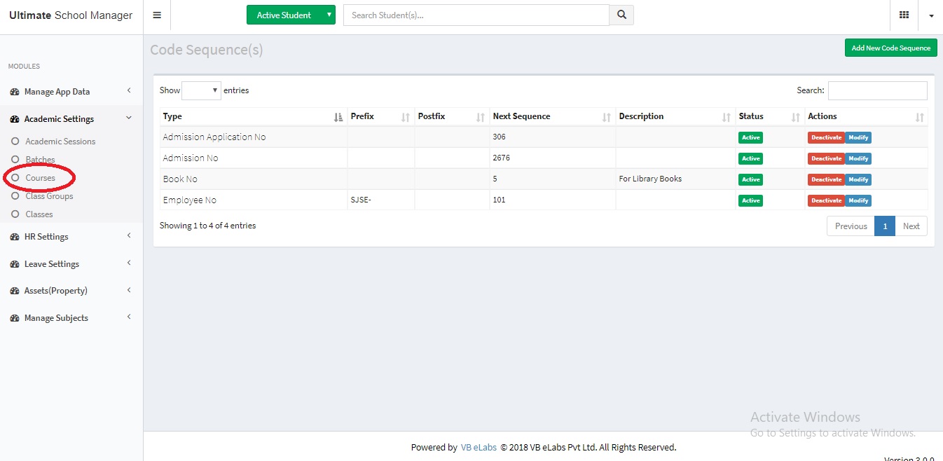 Step 1 : When you click on Courses Sub-module under Academic Settings Module below window will show on your screen. Here you can manage Courses.