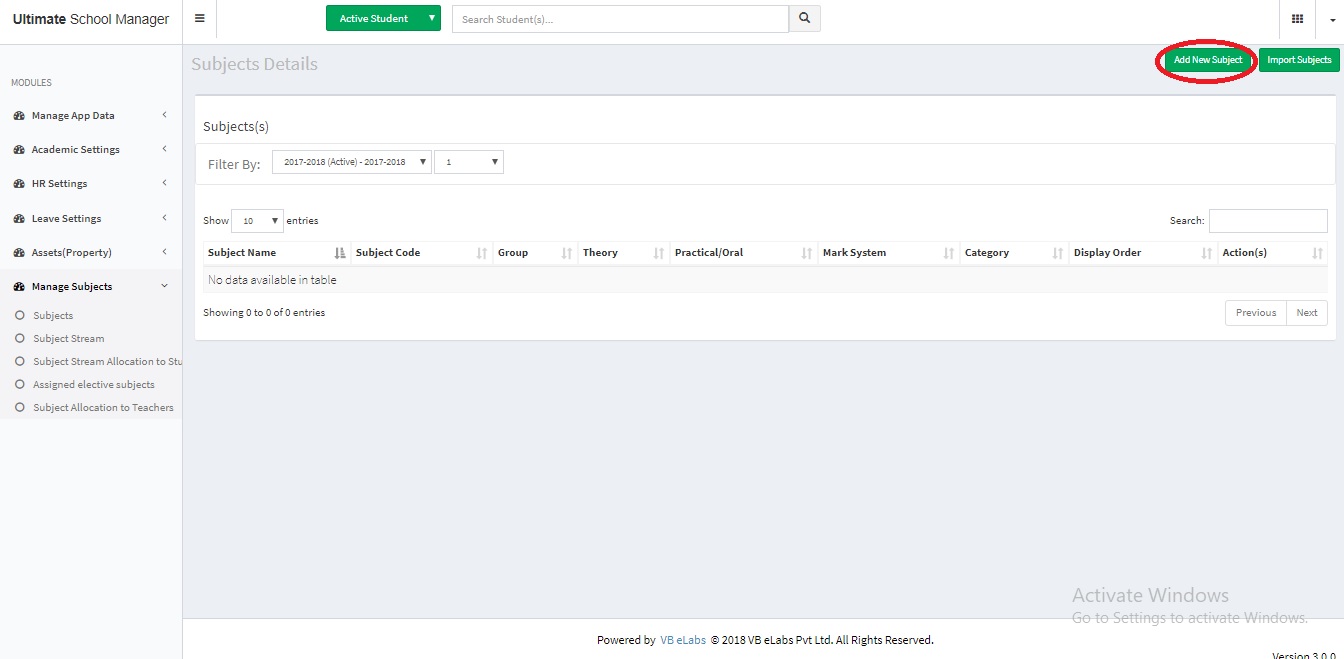 Step 1 : When you click on Subjects under Manage Subjects sub module under Manage App Data Module, below window will be shown to your screen.