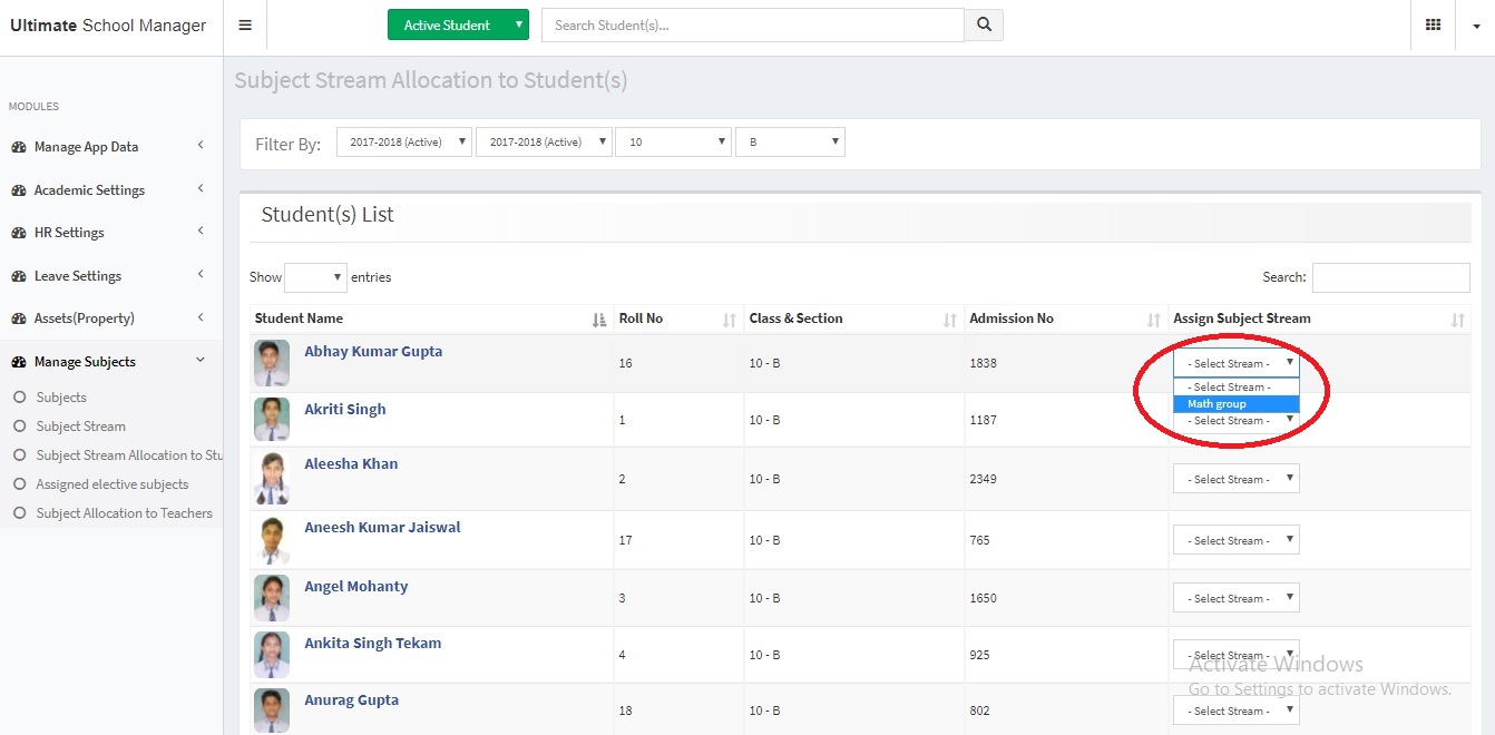 Step 4 : Click on the Select Stream from drop down, to assign student Subject Stream.