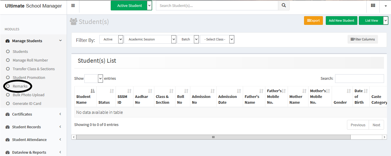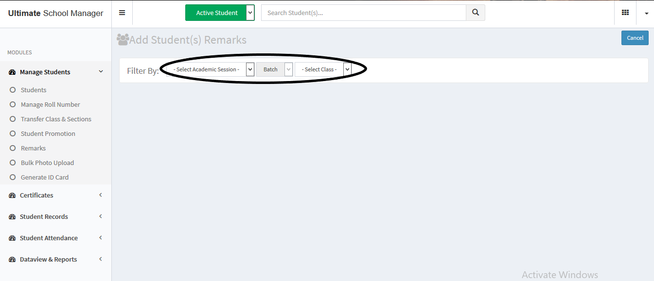 Step 4. Select the class whose students are to be given remark, by selecting the Academic Session, Batch and Class.