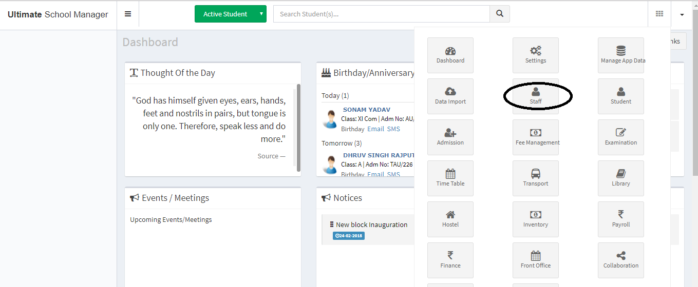 Step 1. Click on the staff module present on the menu bar on the top right of the screen.