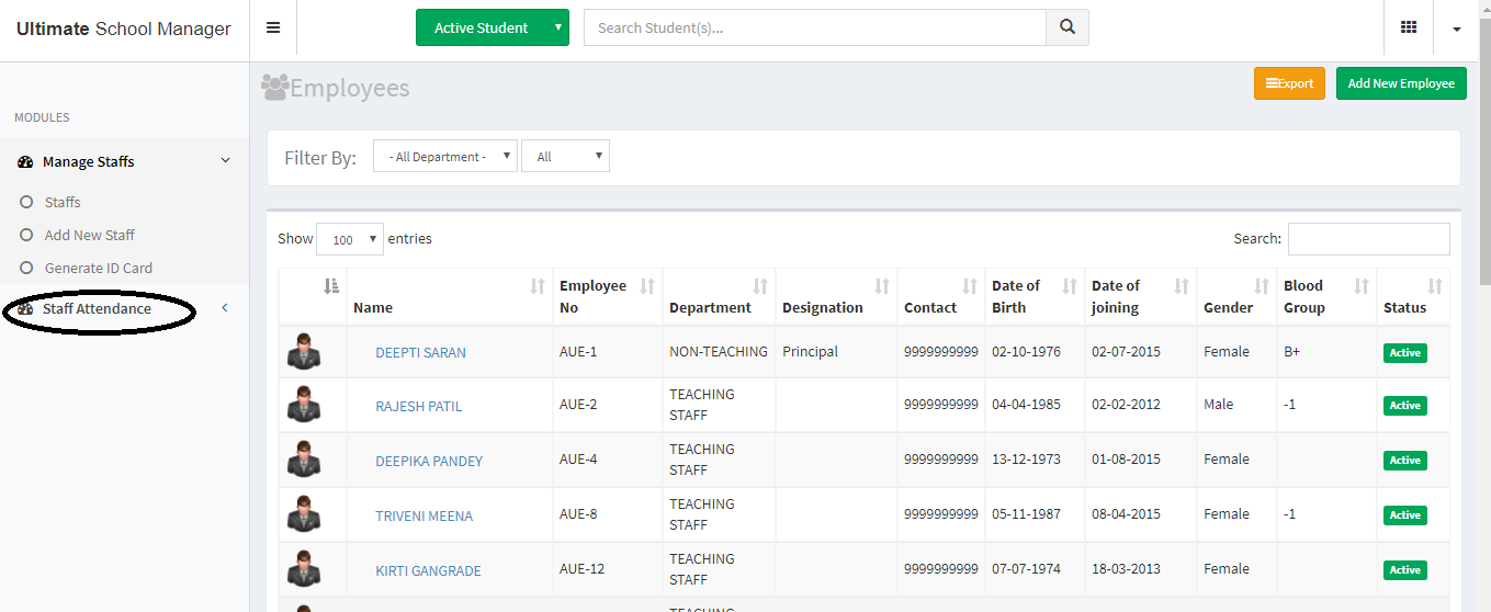 Step 2. Click on the staff attendance option present on the left of the screen.