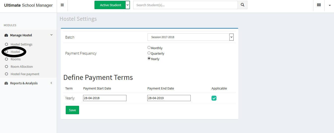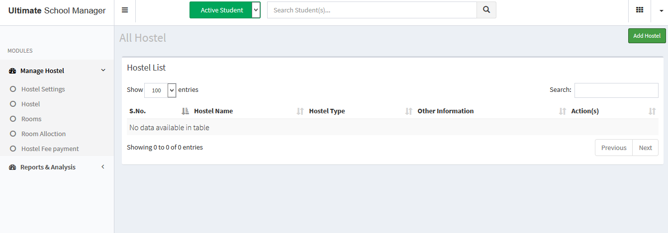 Step 2. Click on the Hostel Module under the Menu Bar.
