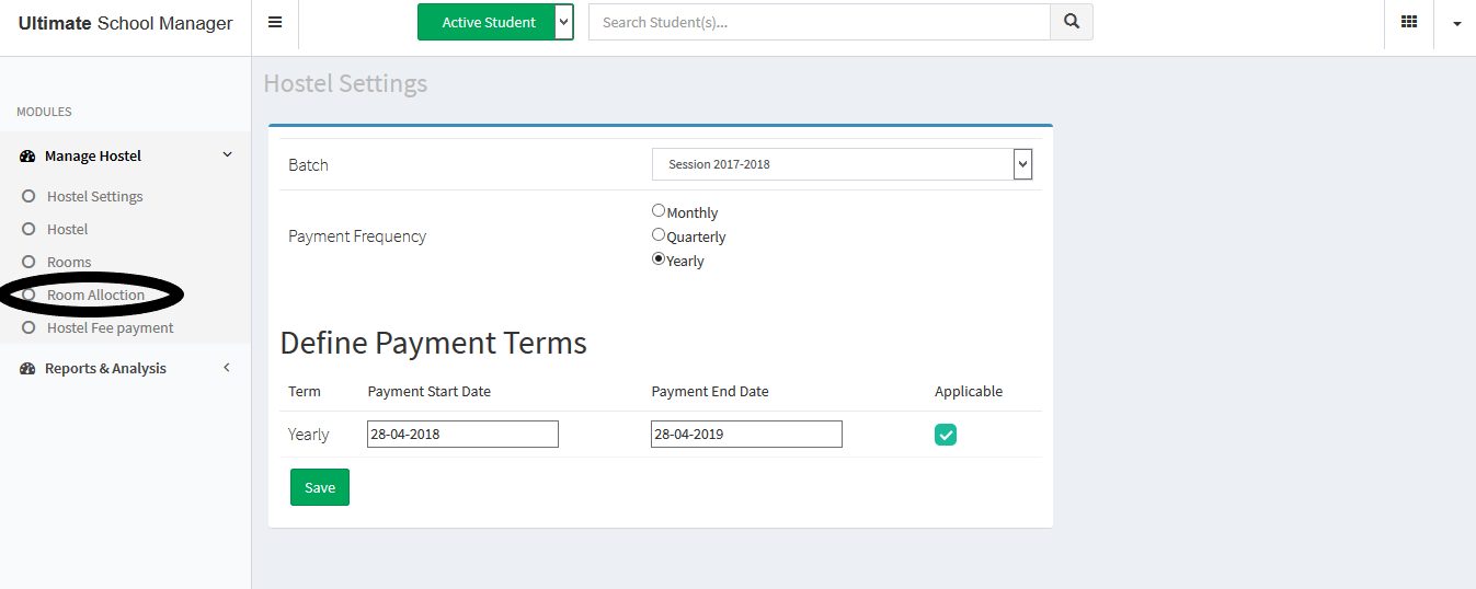 Step 2. Click on the Hostel Module under the Menu Bar.