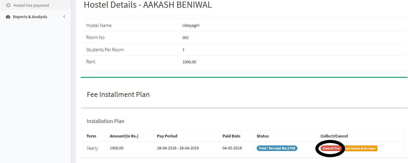 Step 5. Click on Cancel Fee option below the Collect/Cancel column under Fee Installment Plan.