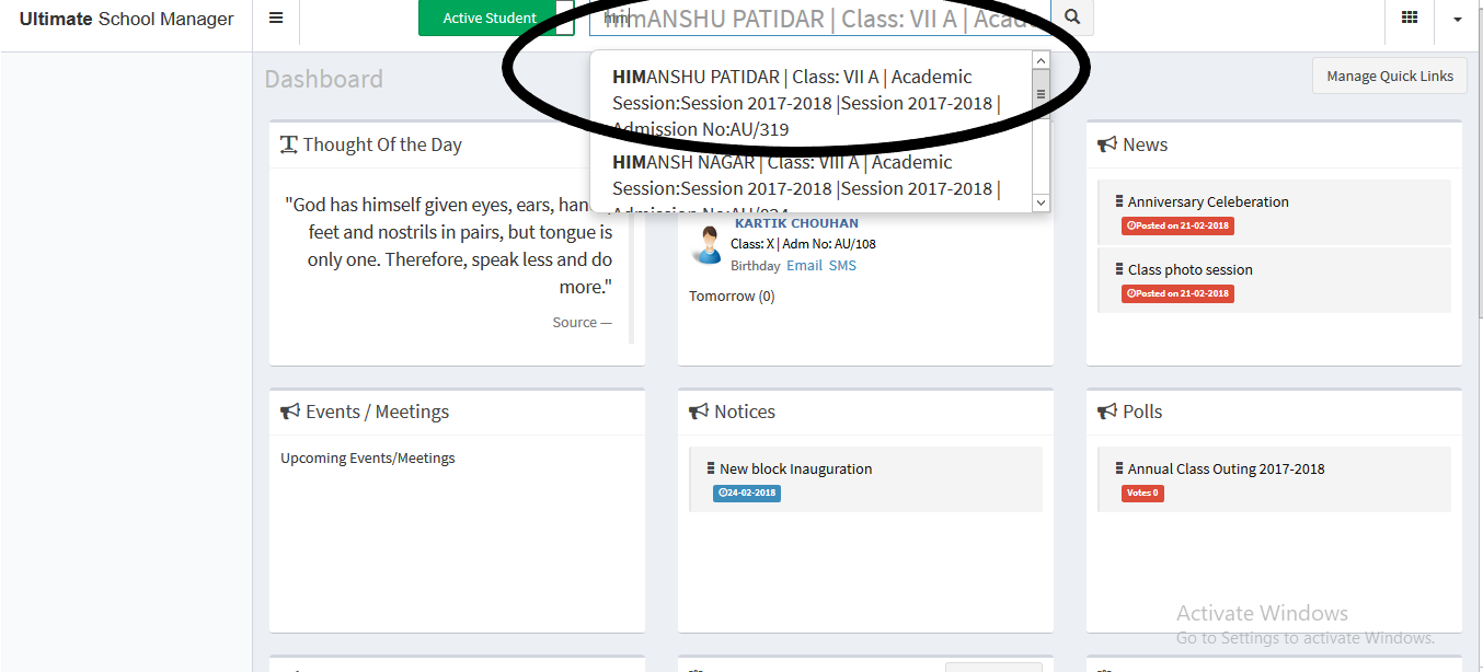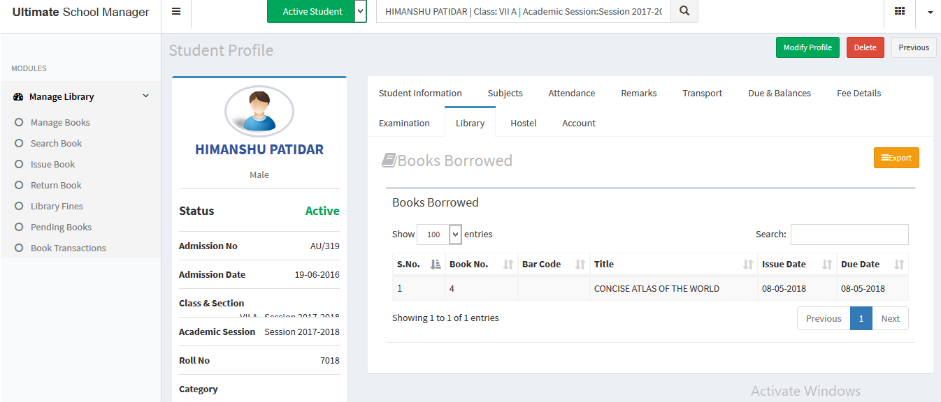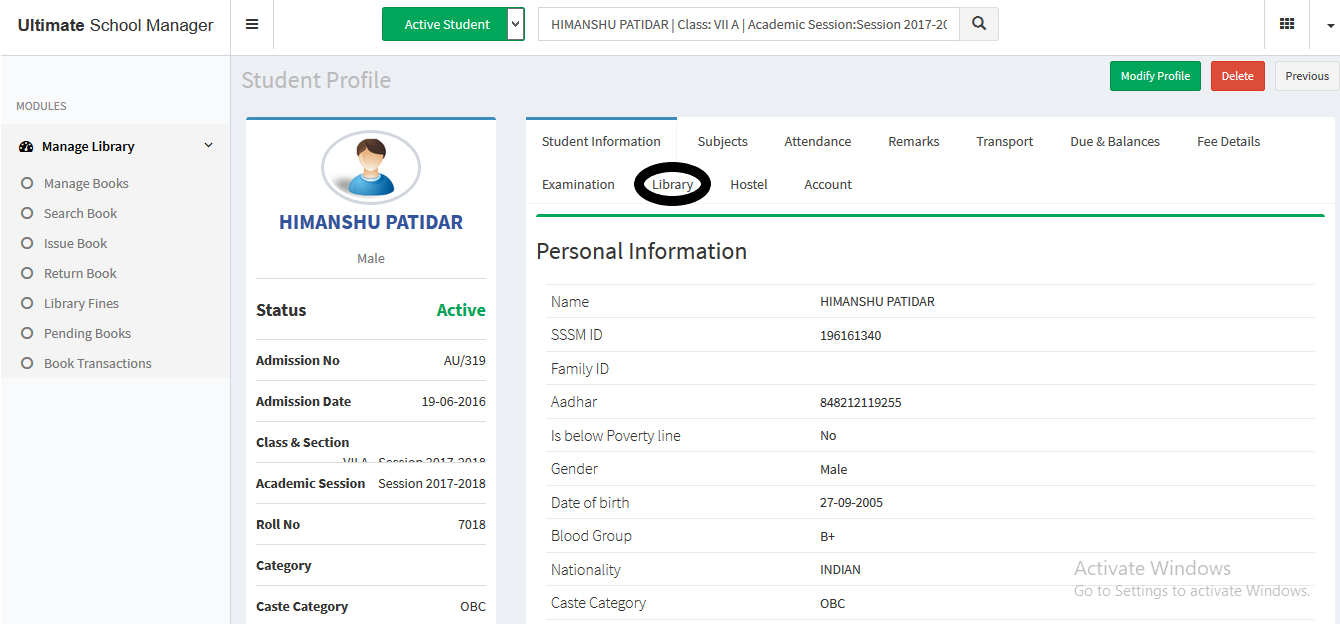 Step 1. Enter and select the name of the student in the Search Bar, whose book transaction history is to be viewed.