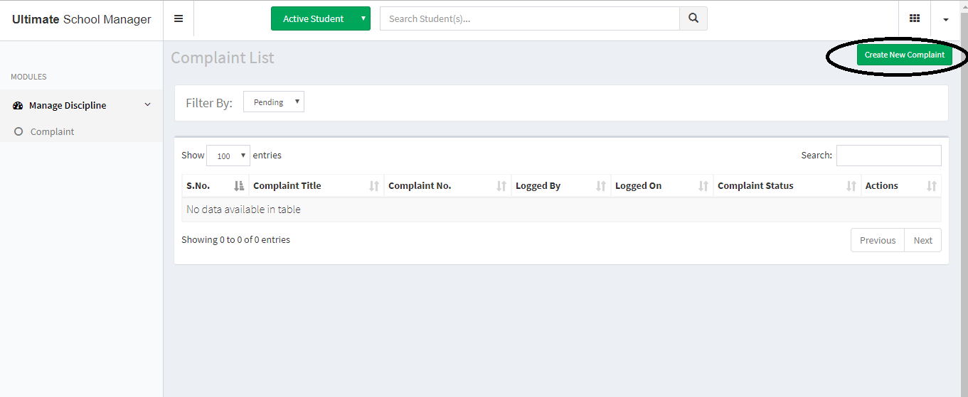 USM allows you to keep track of all the complaints to maintain discipline in school. This feature is available in Discipline module which can be accessed by clicking on the menu bar on the top right of the screen.